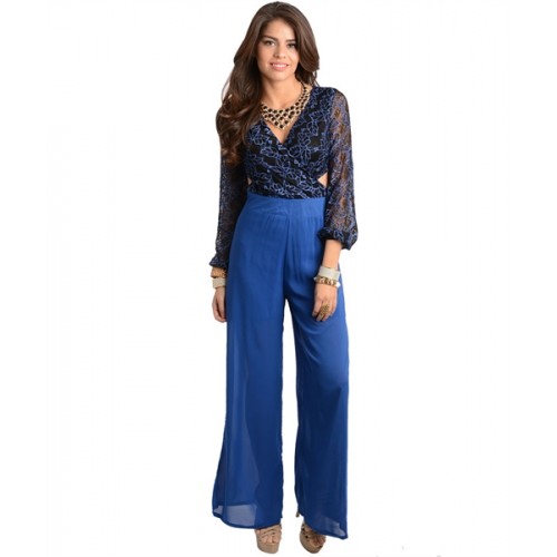 This glam combination romper features a floral lace surplice blouson long sleeve top. Contrast woven wide-leg pant bottom. Keyhole cutout back design.