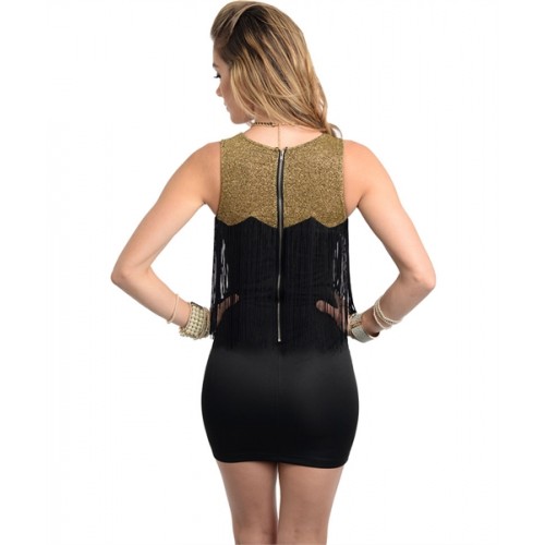 This sassy sleeveless mini dress features a slim, sexy fit with glittered front and back yoke. Exposed back zipper closure with tassel chest and back accent.