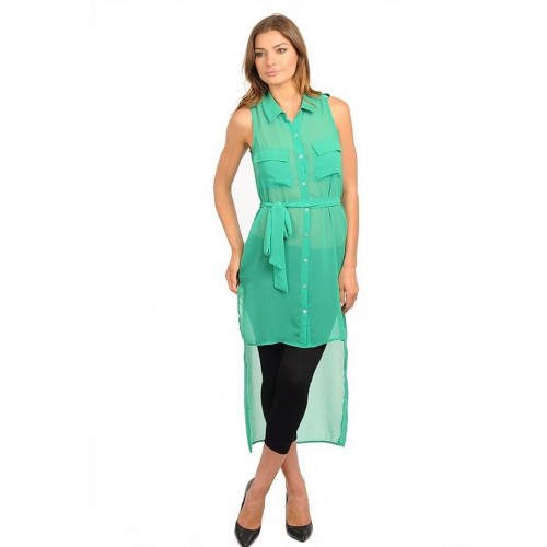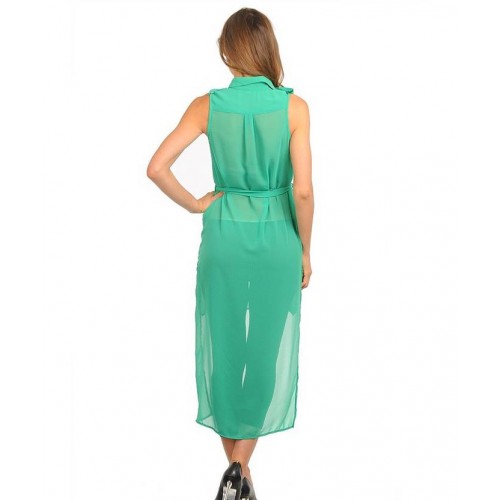 This sleeveless Button Down Collared Sheer High-Low Dress Can Be Paired With Leggings or Worn as is. It Has Double Front Pockets and Waist Sash.